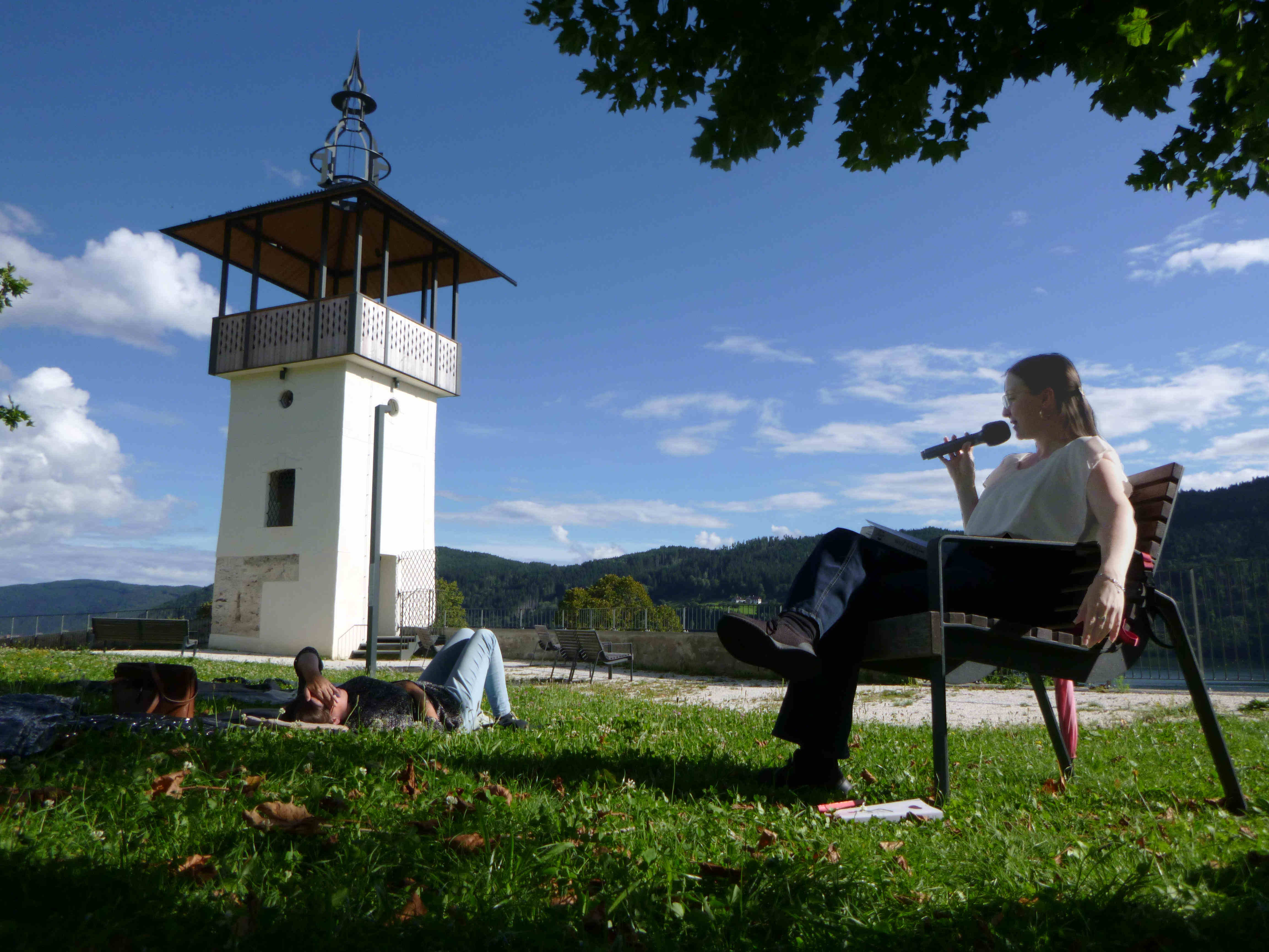 Am 3. August 2025 war es wieder so weit. Ich hielt in Millstatt im Barbara Egger Park (Österreich, Kärnten) meine 3. Lesestunde ab. Sogar Petrus war auf meiner Seite, denn knapp vor vier Uhr klarte der Himmel auf und es gab strahlendes Wetter zu dieser perfekten Kulisse! So viele Neugierige wie noch nie kamen vorbei! Manche lauschten gar vom Turm aus. |
